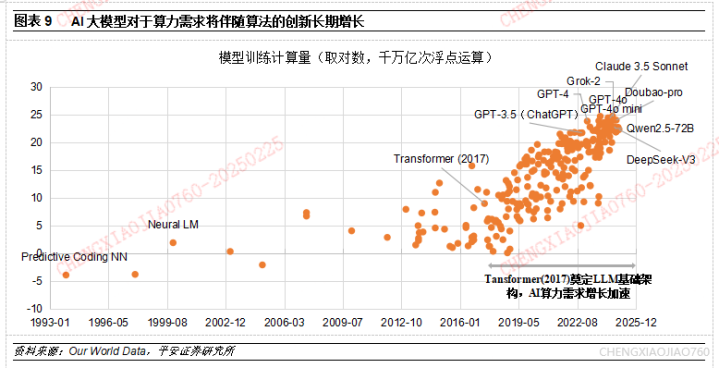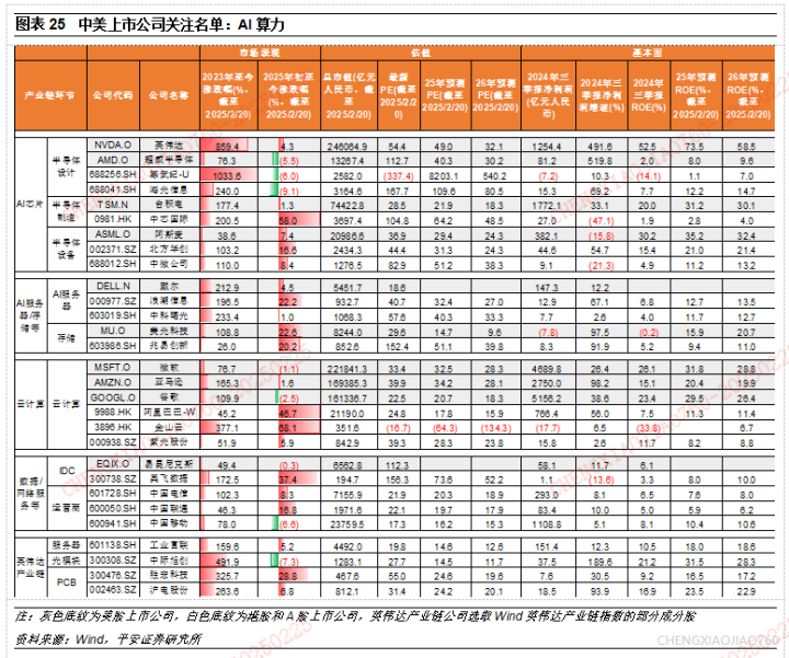此次DeepSeek在模型层的算法实现方面取得创新突破,进而辐射影响至产业链上游的基础层AI算力和下游的应用层普及。本节将重点探讨自2025年1月以来,以DeepSeek为代表的全球最新AI技术创新对产业链上下游发展前景的影响,重点聚焦AI算力和AI应用两个方面。