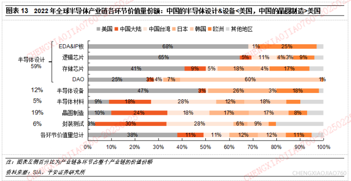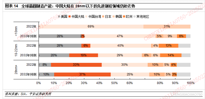 进一步拆解产业链结构,AI芯片设计、半导体设备和先进制程晶圆制造是国产AI芯片自主可控的重点环节。根据美国半导体产业协会(SIA,SemiconductorIndustryAssociation)的研究,半导体设计、半导体设备和晶圆制造是半导体产业链最具价值的环节,而中国在这些环节的发展情况较美国仍存在一定差距。半导体设计方面,中国较美国仍存在差距,尤其是在包含高性能计算芯片(GPU等)的逻辑芯片领域仍以英伟达、AMD等美国公司为主导,2022年,美国在逻辑芯片设计环节的全球价值量份额达到65%,而中国在该环节的价值量份额仅为5%。半导体设备方面,中国仍较大程度依赖进口,尤其在光刻机、刻蚀机等关键设备上对美日荷的依赖较高,2022年,美国、日本和欧洲在半导体设计环节的全球价值量份额达到47%、26%和18%,而中国在该环节的价值量份额仅为3%。晶圆制造方面,中国在成熟制程占据主导,但在先进制程处于劣势,2022年,中国大陆28nm及以上的晶圆制造产能占全球的33%,高于中国台湾的30%和美国的8%,但10nm以下的晶圆制造产能目前仍以中国台湾和韩国垄断,预计随着国产替代进程的加速,未来有望占据一定份额。