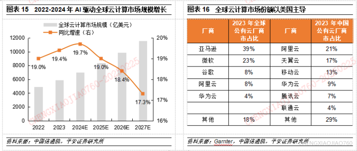 长期来看,DeepSeek代表的技术创新将加速AI应用普及,推动长期算力需求增长并赋能云计算厂商构建AI生态壁垒。据中国信通院2024年初发布的数据,2022-2023年,全球云计算市场规模在AI技术创新的驱动下从4910亿美元增长至5864亿美元,年同比增速呈现上升趋势,2024-2027年整体市场规模预计仍将维持两位数增长。从竞争格局来看,尽管目前全球云计算市场仍以美国科技巨头为主导(如亚马逊、微软、谷歌等),但中国云计算市场仍以国产企业(如阿里云、天翼云、移动云、华为云等)为主导,而DeepSeek为代表的国产AI技术创新有望进一步支持国产云计算厂商构建AI生态壁垒,进一步参与全球市场竞争。