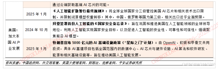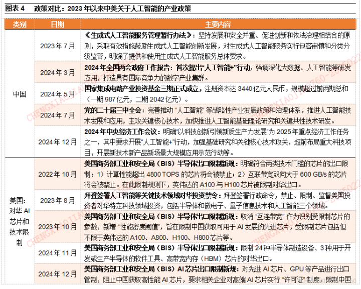 美国:一方面重视本国AI前沿技术研发和基础建设以巩固本国在AI全球领导地位,另一方面通过技术封锁和供应链脱钩对中国AI发展进行限制打压。2023年10月,拜登政府签署《关于安全、可靠和可信的人工智能的行政命令》,旨在加强对AI技术的监管,同时促进创新和投资;2024年10月,该行政令更新,进一步强调巩固和推进美国在人工智能领域的全球领导地位,利用人工智能实现国家安全目标;2025年1月,特朗普政府就任之初便宣布5000亿元的AI基础设施政策(“星际之门”计划),重点投向全国范围内的数据中心、AI芯片和相关硬件设施、算法与软件研发等,旨在进一步推动本国人工智能产业发展。对华政策上,美国延续2020年以来的“小院高墙”战略,通过出口管制、实体清单、投资限制等手段,切断中国获取高端AI算力芯片、先进半导体设备和关键技术、先进算法的渠道,并限制美国企业对华人工智能领域的投资。