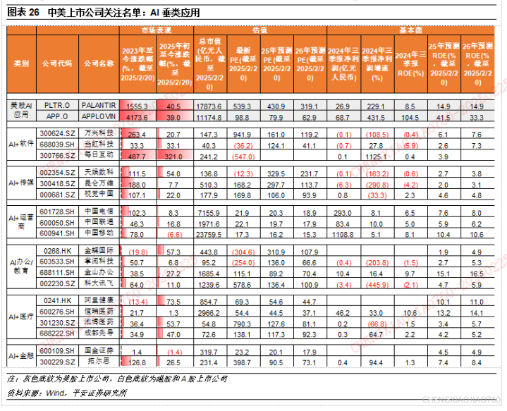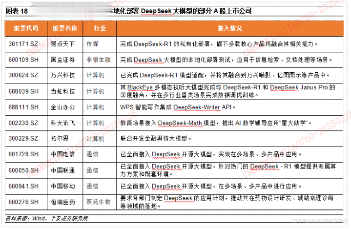 2025年,DeepSeek等AI技术创新有望加速AI垂类应用拓展,关注AI应用普及较快的计算机、运营商、金融以及应用普及有望加速的政府、制造、教育、医疗等行业。一方面,DeepSeek的高性能低成本大模型在短期加速了各行业AI模型的应用。根据Wind数据,截至2025年2月14日,已有98家A股上市公司宣布接入DeepSeek大模型,行业涵盖计算机、传媒、电子、通信、金融、医疗等。另一方面,DeepSeek有望倒逼其他AI企业重新考虑开源策略和降费,进而加速AI技术的迭代和普及。2月6日,美国OpenAI官方宣布将向所有用户免费开放ChatGPT搜索功能,无需注册;2月14日,百度官方宣布将陆续推出文心大模型4.5系列,并于6月30日起正式开源。