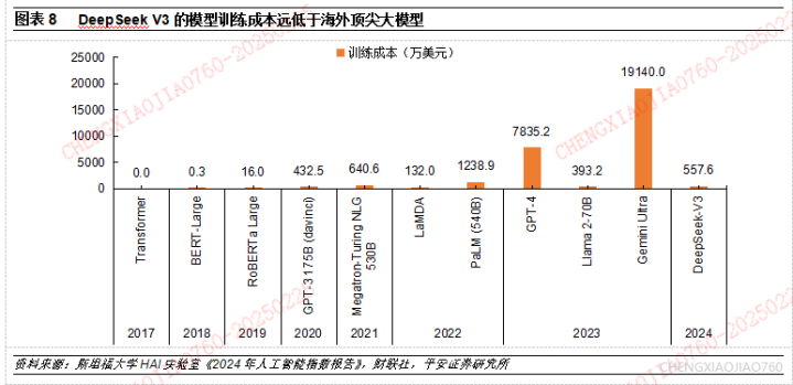 短期而言,DeepSeek通过算法创新提高算力利用率,冲击了海外科技公司“堆算力”的训练模式,引发了市场对训练算力需求预期边际放缓的担忧。据DeepSeek公布的数据显示,DeepSeekV3模型的训练总计只需要278.8万GPU小时,相当于在2048卡的H800GPU集群上训练约2个月,合计开发成本约557.6万美元,训练算力仅为Llama3模型的十分之一(Llama3训练成本达3930万H100GPU小时),推理阶段缓存数据量降低了50倍。相较而言,OpenAI的GPT-4、谷歌GeminiUltra的训练成本分别达7835万美元和1.91亿美元。短期来看,DeepSeek的算法创新极大提高了算力利用率,这一创新可能倒逼全球科技公司调整模型训练模式,更多采用类似技术路径或加大算法创新来降低对高性能算力资源的依赖,进而导致短期AI大模型训练算力需求的预期边际放缓。