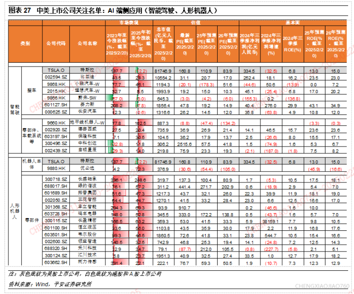 AI应用方面,DeepSeek代表的“开源、高性能、低成本”大模型将进一步降低AI技术使用门槛。一方面,这将加速AI垂类应用的开发与普及,为计算机、运营商、金融、政府、制造、教育、医疗等行业深度赋能。另一方面,有望推动AI技术与智能终端的深度融合,加速人形机器人和智能驾驶等前沿领域的发展,产品需求放量后有望直接利好产业链相关赛道。根据政策导向和主要企业规划,2025年人形机器人有望迎来量产关键时间节点。美国的特斯拉于年初已公布人形机器人OptimusGen2的2025-2027年的量产计划,中国的优必选表示将于2025年二季度具备人形机器人WalkerS的规模化交付条件;高阶智能驾驶也有望在2025年加速普及,比亚迪于2025年2月20日宣布旗下全系车型均将搭载“天神之眼”高阶智驾系统,最低覆盖至7万元级别车型。