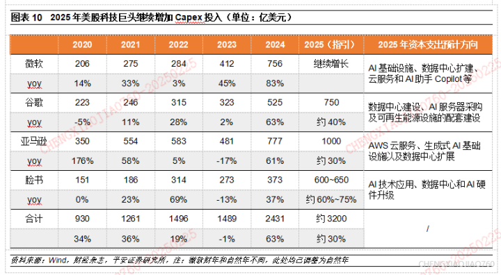 长期而言,AI算力需求增长的趋势仍未改变。一方面,通用人工智能(AGI)的探索仍在持续,将继续支撑训练算力需求长期增长。2017年,谷歌提出Transformer算法创新奠定了大模型(LLM,LargeLanguageModel)的基础架构,自此,以AGI愿景的人工智能研究推动算力需求进入指数增长周期。尤其是2022年11月ChatGPT发布以来,随着大模型参数规模的不断扩大(从亿级到万亿级),以及多模态、跨领域任务的复杂性增加,模型训练资源需求显著提升。全球科技巨头也在持续加码AGI投入。2025年DeepSeek引爆市场后,美国四大科技巨头仍宣布继续加大2025年资本支出投入,重点投向AI算力领域(包括芯片采购、服务器采购、数据中心建设等算力基础设施)。据最新财报显示,2024年微软、亚马逊、谷歌、Meta的资本支出合计达2431亿美元,同比增长63%;对于2025年的指引,微软计划资本支出将环比增加;亚马逊计划1000亿美元资本支出,增速将接近30%;谷歌计划750亿美元资本支出,增速将超过40%;Meta计划约600亿-650亿美元的资本支出,增速将达60%-75%。