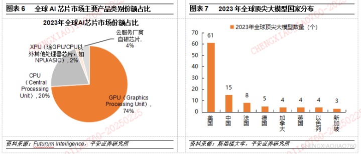 1.AI基础层:美国较中国领先,尤其是在高性能AI芯片领域较中国具有明显优势。
