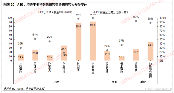 展望市场,伴随国内新兴科技创新力量的崛起,中国科技资产价值重估的空间有望进一步打开,关注AI赛道为主的科技创新板块,细分领域上关注国产算力自主可控、AI应用普及+端侧落地。在此次DeepSeek在全球爆火的同时,国内以阿里巴巴、字节跳动为主的互联网科技巨头、以宇树科技为主的初创企业也在相关赛道展示了中国新兴科技创新的力量,市场情绪得到明显提振,中国科技资产迎来重估。横向比较来看,经过前期上涨后,目前A股、港股的主要指数估值相较于美股仍有较大修复空间。后续,伴随着国产创新进展成果的进一步涌现,2025年资本市场的结构性机会继续增加,重点关注以AI赛道为主的科技板块。结合前文AI产业前景展望的结论,细分方向上我们建议关注两条主线:一是国产AI算力自主可控,包括AI芯片的国产替代、云计算厂商的业务拓展;二是AI应用普及+端侧落地,包括垂类应用的普及(计算机/运营商/金融/制造/教育/医疗等)、人形机器人和智能驾驶的发展空间。