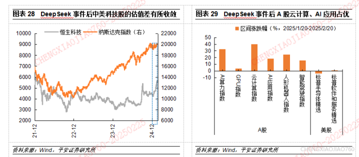 从资本市场的反应来看,DeepSeek事件后,中美科技股的估值差有所收敛,云计算、AI应用的表现优于AI芯片。分市场来看,2025年1月20日DeepSeekR1大模型发布后,A股和港股的科技板块上涨,而美股科技板块震荡调整,截至2025年2月20日,恒生科技指数累计上涨22.8%,A股的科创50、创业板指分别上涨7.0%和7.7%,美股的纳斯达克指数先调整后反弹,累计小幅收涨1.7%,年内累计涨跌幅来看,港股恒生科技指数已经领涨全球权益。分产业链环节来看,云计算、AI应用的市场表现优于AI芯片。2025年1月20日-2月20日,A股的云计算指数、AI应用指数分别上涨39.9%和18.6%,而GPU指数仅上涨4.0%,叠加近期人形机器人和智能驾驶产业相关催化的增加,人形机器人、智能驾驶概念指数上涨24.6%和15.9%;美股方面,标普半导体精选指数下跌3.6%,而标普软件和服务指数小幅上涨0.5%,英伟达、AMD、台积电的股价在DeepSeek爆火后均在短期出现明显调整。