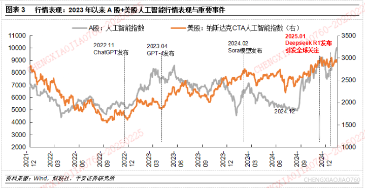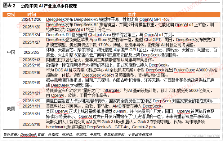 我们认为,DeepSeek为代表的前沿技术创新有望重塑全球AI竞争格局,进而影响全球资本市场定价,中国AI科技资产价值重估、AI应用和端侧落地是市场关注的重点。本篇报告将以DeepSeek为切入点,在回顾AI产业政策与竞争格局的基础上,讨论最新AI技术创新对全球AI产业发展模式的影响,并重点聚焦AI算力、AI应用两个方面,梳理中美相关领域的重点上市公司关注名单,展望资本市场的相关投资机遇。