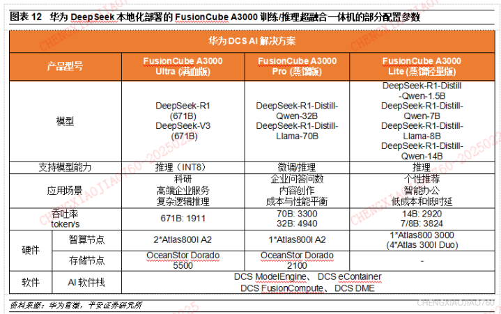 美国对华禁售高性能AI芯片的背景下,DeepSeek的算法创新有望进一步打开国产AI芯片自主可控的空间。AI芯片是AI算力的核心,2023年以来的半导体周期复苏总体由AI算力需求驱动,未来AI算力需求的长期增长有望打开半导体产业空间。而随着DeepSeek等科技公司在算法优化上取得突破,国产AI芯片自主可控的空间有望进一步打开。尤其在AI应用加速普及之下,推理侧算力需求有望进一步增加,而由于推理侧对AI芯片的性能要求低于训练侧,国产芯片可以通过算法与硬件的协同优化在性能上逐步缩小与国际领先水平的差距。根据智东西报道,目前已有16家国产AI芯片公司(包括华为昇腾、沐曦、天数智芯、摩尔线程、海光信息、壁仞科技、太初元碁、云天励飞、燧原科技、昆仑芯等)相继宣布适配或上架DeepSeek模型服务,共同推动国产AI芯片在大模型训练、推理等场景的应用,尤其是本地化部署的推理场景。2月11日,华为官方宣布,基于昇腾系列芯片的MindSpeed模型训练加速库已适配支持DeepSeekV3模型的预训练与微调、R1模型复现项目OpenR1等。2月16日,华为发布针对DeepSeek本地化部署的FusionCubeA3000训练/推理超融合一体机,深度适配DeepSeekV3&R1及蒸馏模型,预训练、微调以及推理;其中,硬件端的智算节点使用华为AI推理服务器Atlas800IA2,搭载华为自研鲲鹏920处理器和昇腾910AI处理器,满血版可以适配DeepSeekR1、V3的671B模型。