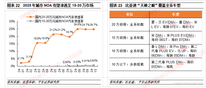 车企端来看,头部车企正在积极布局高阶智能驾驶普及,2025年城市高阶智能驾驶有望加速渗透15-20万元车型,需求放量后有望直接利好产业链相关赛道(尤其是核心零部件)。根据佐思车研的研究,主要车企的智能驾驶解决方案主要包括自研和与第三方智驾供应商合作两种方式,技术路径自2023年以来逐步从高速NOA(NavigateonAutopilot,导航辅助驾驶)向城市NOA过渡推进,中美主要车企也在加速城市NOA的公测/推送进程,包括特斯拉、蔚来、小鹏、理想、赛力斯等。智驾车型价格级别也有望在2025年进一步渗透15-20万元级别。根据佐思车研的研究,2024年国内城市NOA在20-25万元车型的渗透率从1月的2.1%提高至10月的24.7%,而25-20万元车型的渗透率还不足1%。2025年2月20日,比亚迪召开智能化战略发布会,正式推出“天神之眼”高阶智驾系统,并宣布旗下全系车型均将搭载“天神之眼”高阶智驾系统,最低覆盖至7万元级别的车型。作为全球销量领先的车企,比亚迪此次“全民智驾战略”有望进一步加速高阶智驾的普及。