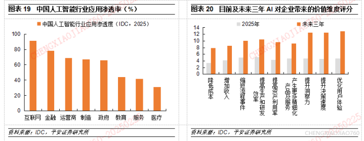 从AI垂类应用的行业拓展空间来看,根据IDC于2025年2月发布的最新研究,2024年全球生成式人工智能基础设施投入主要集中在互联网、运营商和IT服务三大行业,未来该三大行业的占比有望逐步减少,进而转向政府、金融、制造、教育和医疗领域;从中国来看,目前人工智能渗透率前三的行业分别是互联网、金融和运营商,而制造、政府、教育、服务和医疗行业的渗透率还有较大提升空间。AI垂类应用的普及也有望从提升生产和研发效率、加速产品创新、优化用户体验等方面为各行业带来技术赋能。